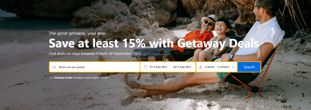 In the event that you are not aware, getaway deals start at 15% off. Also, discounts are applied to the original price of a room, before taxes and charges. The discounted prices offered as Getaway Deals can’t be combined with other discounts, except for genius discounts. Booking.com: Deals
